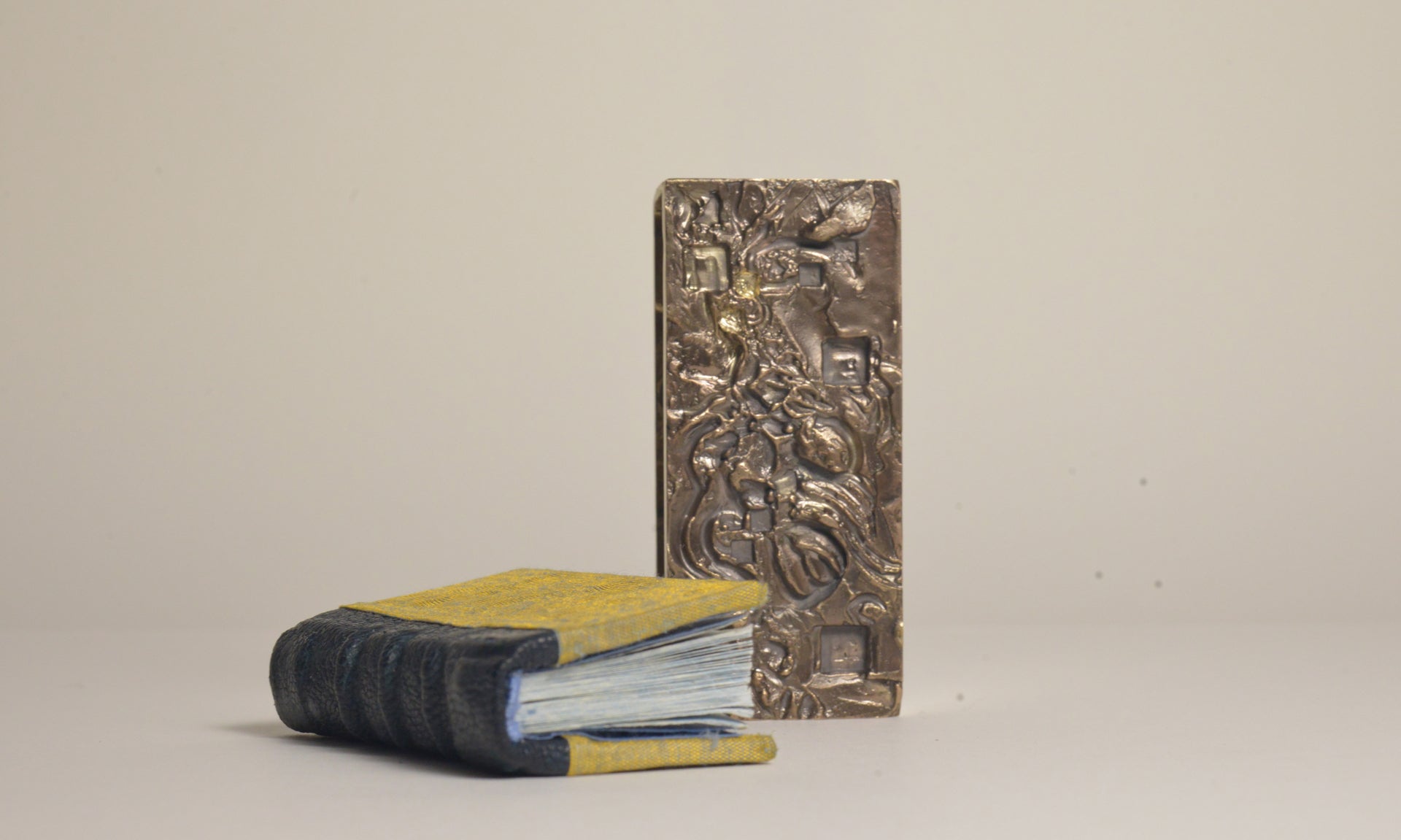 Media: Cast Bronze Case with hand bound book, leather, cord, silk | Dimensions: 3” x 1.5” x 1”
