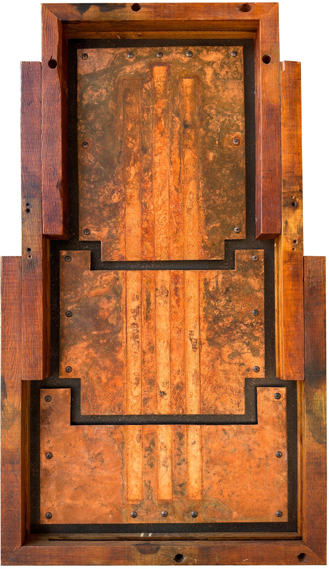 | My art is a unique genre, the composition is exposed to the environment and nature creates the art: I placed 3 vertical pieces of copper outdoors for 3 months with 3 steel straps setting on top of it. The art deco composition was influence by the frame made from a reclaimed antique table extension. |