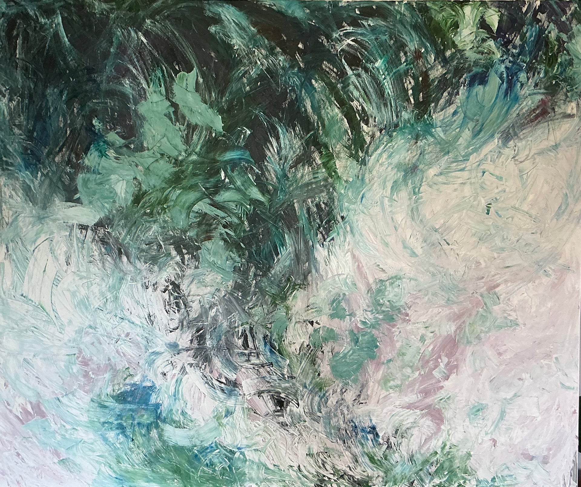 | Impression of an old master style of work, a threatening storm in dark greens and black reaches down from the sky to froth the ocean into white and pink swirls. |