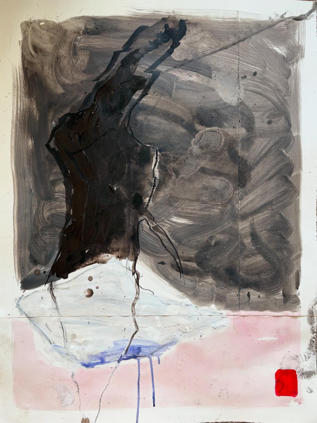 | Add approx. 1" all around for framing. Multiple layers of thick and thin paint, a mix of drawing and painting. Subtle paint strokes, marks, drips, hand prints and foot prints shows through. The "red rectangle" is my signature. |