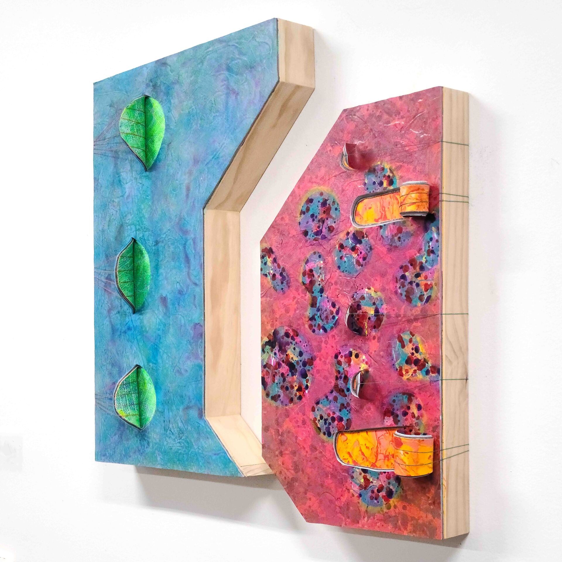 | A diptych wall sculpture that explore the visceral interplay between surface tension and excavated histories. The thick multi-layered surface is peeled back to reveal the original surface. |