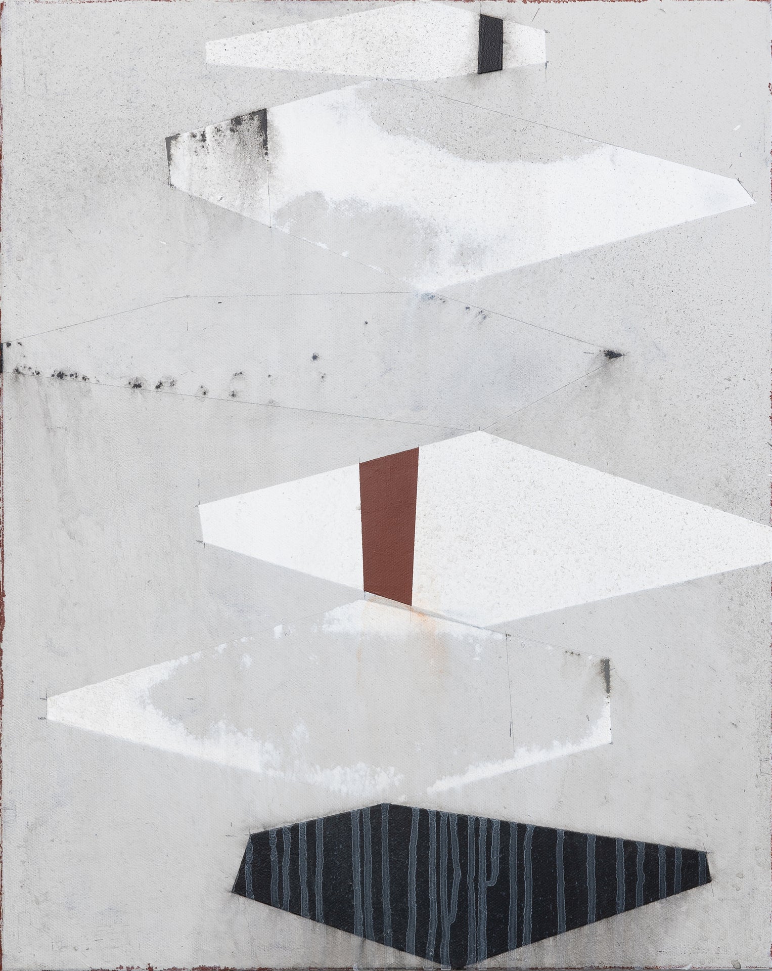| This textural abstract is a demonstration of contrasting shapes and processes. Layers of pigment are precisely applied, and selectively removed. As shapes are degraded, a mist of pigment settles in delicate overlapping layers atop underlying texture creating shrouds of color in organic patterns. |